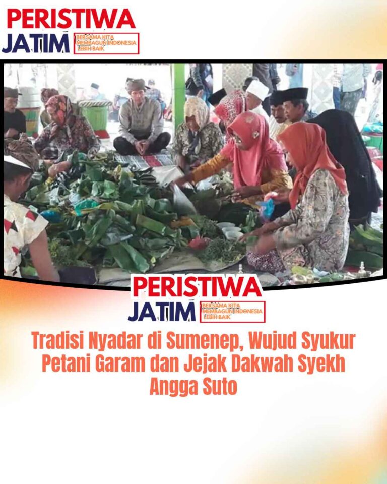 www.peristiwaJatim.com.ǁSumenep,13 Februari 2026-Tradisi Nyadar atau Nadar masih lestari di tengah masyarakat Desa Pinggir Papas dan Kebundadap Barat, Kabupaten Sumenep, Madura. Upacara adat yang digelar tiga kali setiap tahun ini menjadi penanda musim panen garam sekaligus bentuk rasa syukur para petani atas hasil yang diperoleh. Nyadar dilaksanakan berselang sekitar satu bulan pada setiap tahapannya. Tradisi ini erat kaitannya dengan sosok Syekh Angga Suto atau Emba Anggasuto,…