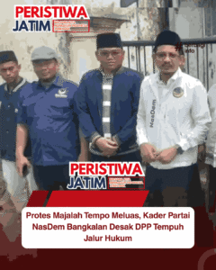 www.peristiwaJatim.com.ǁBangkalan,15 April 2026-Protes kader Partai NasDem terhadap Majalah Tempo semakin meluas di berbagai daerah. Giliran puluhan kader dan fungsionaris DPD Partai NasDem Bangkalan berkumpul di kantor DPD, Kelurahan Mlajah, Bangkalan, Rabu (15/4/2026), untuk meluapkan kekesalan dan mendesak DPP Partai NasDem menempuh jalur hukum. Ketua DPD Partai NasDem Bangkalan, Nasih Aschal menilai framing dan fitnah yang dilakukan Majalah Tempo terhadap Partai NasDem dan Ketua Umum Surya Paloh membuat seluruh kader…