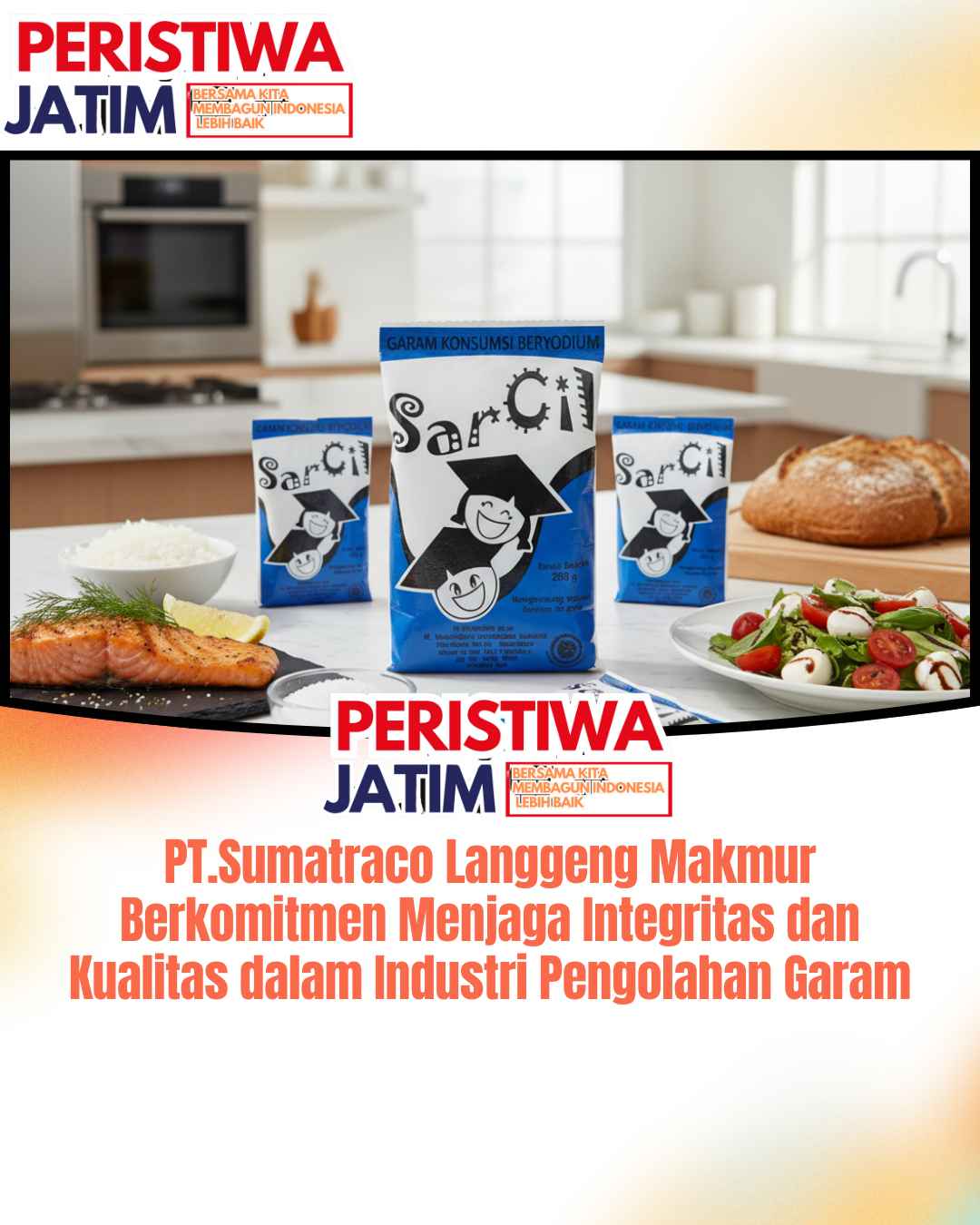 www.peristiwaJatim.com.ǁSurabaya,7 Januari 2026-PT.Sumatraco Langgeng Makmur, perusahaan nasional yang bergerak di bidang produksi dan pengolahan garam, terus menunjukkan komitmennya dalam menjaga integritas, kualitas, serta daya saing produk di tengah dinamika industri pengolahan garam yang semakin kompetitif. Berbasis di Surabaya, perusahaan ini secara konsisten mengedepankan standar mutu tinggi sebagai landasan utama dalam setiap proses produksinya.